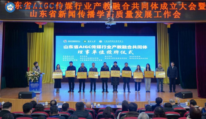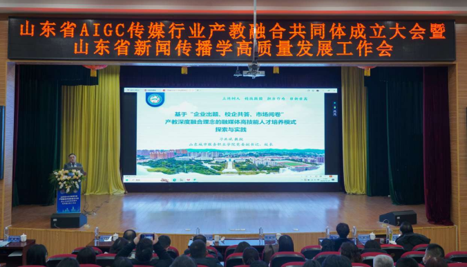 2024年11月29日,山东省AIGC传媒行业产教融合共同体成立大会暨山东省新闻传播学高质量发展工作会在山东烟台隆重举行。此次大会由鲁东大学、烟台市融媒体中心、山东城市服务职业学院作为牵头单位,联合相关行业协会、高校、企业等共同发起,旨在构建资源共享、优势互补、协同创新的生态系统,推动山东省乃至全国的传媒行业和新闻传播学高质量发展。山东圣翰财贸职业学院云商传媒学院院长李学治、实习就业办公室主任冯兴师代表学校参加了此次盛会。