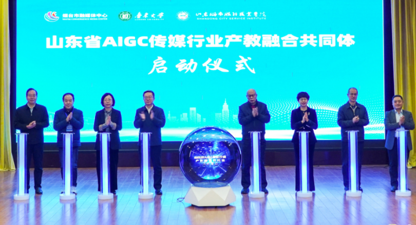 会上,烟台市委常委、宣传部部长、教育工委书记吕波,鲁东大学党委常委、副校长向平,烟台融媒体中心主任、烟台传媒集团董事长李波,山东城市服务职业学院党委书记宋宁分别致辞,并与教育部新闻传播学科教育指导委员会委员刘明洋、山东省新闻传播学科教指委主任委员、山东师范大学新闻与传媒学院执行院长常庆等共同按下启动键,标志着山东省AIGC传媒行业产教融合共同体的正式成立。