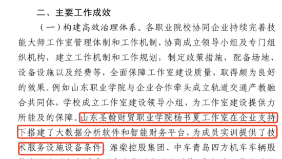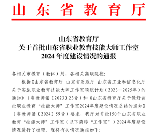 12月4日,山东省教育厅印发《关于首批山东省职业教育技能大师工作室 2024年度建设情况的通报》,“山东圣翰财贸职业学院杨书夏工作室”被评定为“建设成效好”的工作室。同时,在文件正文“主要工作成效”部分,共介绍了全省8所高职院校的工作成效,杨书夏工作室的工作成效被写入其中进行全省介绍。