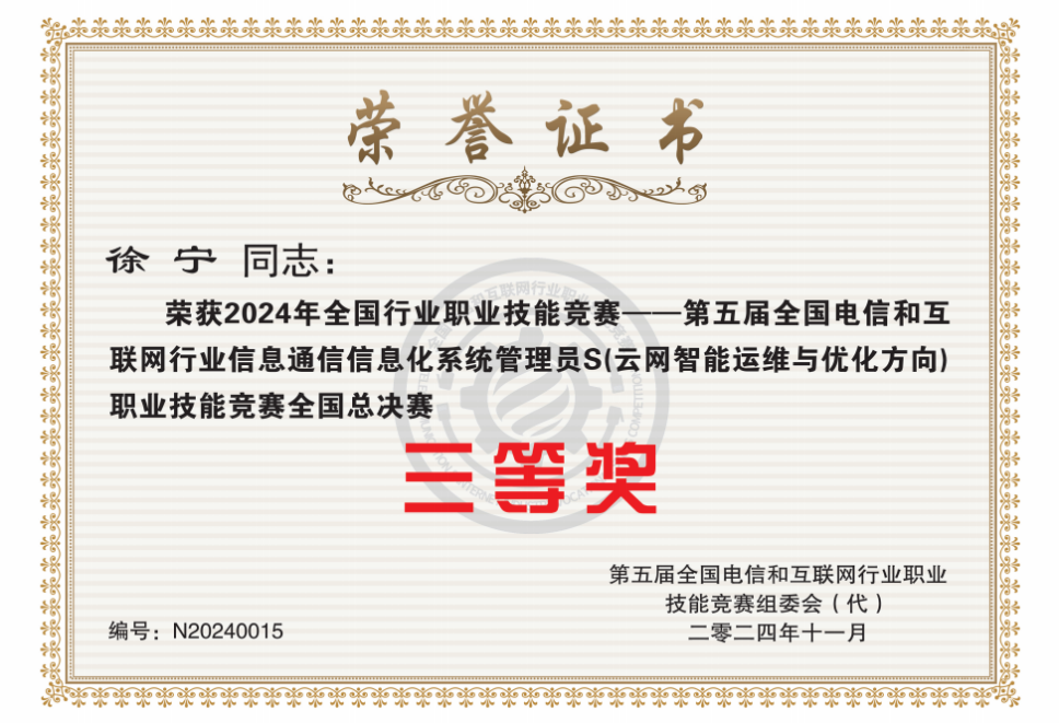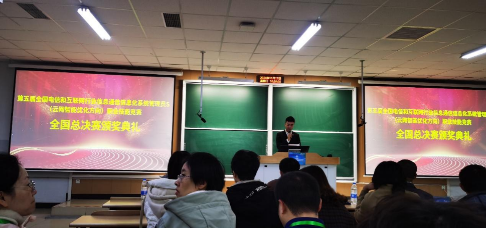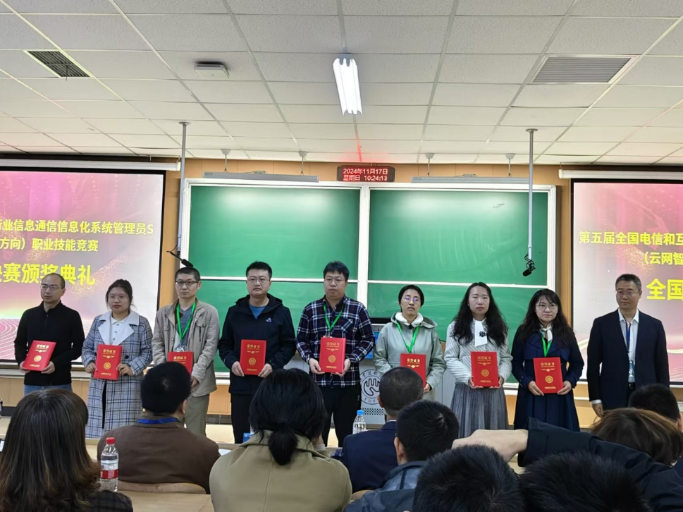 11月17日上午,2024年全国行业职业技能竞赛——第五届全国电信和互联网行业信息通信信息化系统管理员S(云网智能优化方向)职业技能竞赛全国总决赛在天津职业技术师范大学圆满落幕,我校信息工程学院教师徐宁凭借扎实的专业功底和出色的发挥,从全国20省份70余所高校的顶尖选手中脱颖而出,荣获职工组三等奖。 此次竞赛由人力资源和社会保障部批准,是国家二类职业技能竞赛。大赛旨在弘扬劳模精神、劳动精神和工匠精神,推动信息通信技术技能人才培养,提升行业整体技术水平。来自全国各地的优秀选手经过层层选拔,共同角逐全国总决赛的桂冠。
