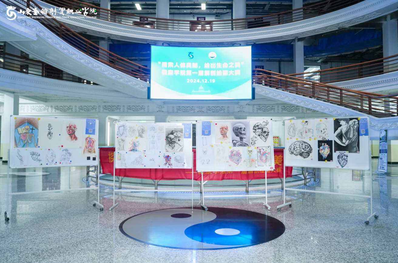 本次大赛通过初赛选拔,共计选出50余份作品,在学校内的吉纯楼二楼大厅展示,现场布置简洁而不失庄重。大屏幕上醒目的主题标语,仿佛在向每一位参赛学生和观众宣告此次大赛的意义与目标。屏幕下方整齐地摆放着多个展示画板,每一块画板上都展示着一幅幅令人惊叹的解剖绘画作品,这些作品像是一扇扇通往人体奥秘世界的窗户。