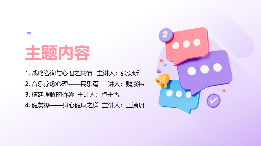 心理健康联合课堂旨在打破学科界限,深入理解心理领域的丰富内涵,领略不同领域知识碰撞所产生的奇妙效果,为学员的全面发展提供更为广阔的视野和多元的思维方式。本次心理健康联合课堂的四位主讲人分别围绕学生在音、体、美以及德智发展四大方向,深度展示不同专业对学生心理所产生的多元影响。项目分别从战略设计、体育、音乐、哲学这四个独特视角出发,全方位呈现不同学科思维在心理领域所发挥的重要作用。
