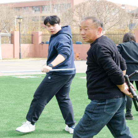 座谈会结束后,来自山东圣翰财贸职业学院的教师团队以“学生”身份沉浸式体验非遗技艺。在传承人的指导下,众人学习了“狮子张口”“八步赶蝉”“鹞子翻身”“海底捞月”“推窗望月”“苏秦背剑”等经典双棒动作,亲身感受鼓子秧歌“稳、沉、抻、韧”的力道美学与文化内涵。非遗传承人强调:“双棒的每一式都源自劳动场景,握棒如握锄,踏步如夯土,只有理解背后的生活智慧,才能跳出鼓子秧歌的精气神。”