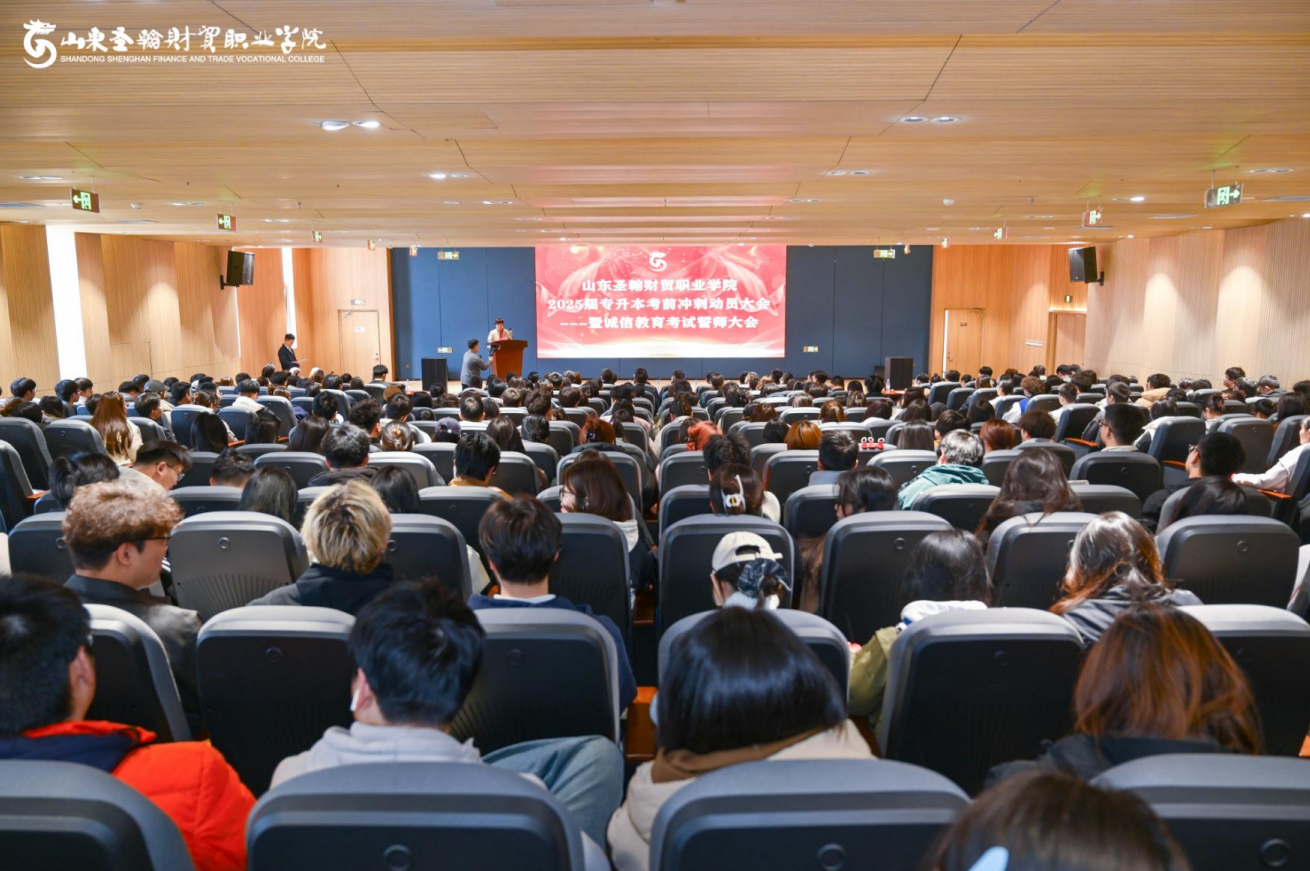 为激发学校2025届专升本考生的拼搏精神,强化诚信应考意识,3月19日,山东圣翰财贸职业学院在专升本校区路演大厅举行2025届专升本考前冲刺动员大会暨诚信教育考试誓师大会。