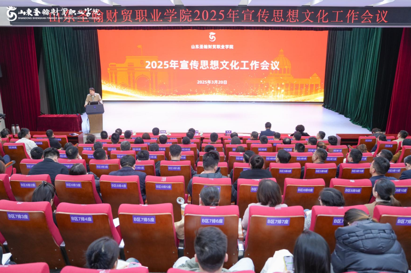 3月20日下午,山东圣翰财贸职业学院2025年宣传思想文化工作会议在吉纯楼第二报告厅召开。党委书记高磊,校长刘广耀,党委副书记、常务副校长姜峤,副校长阎磊,工会主席许锐,党建工作指导员侯伟出席会议。党委宣传部副部长李晓亮主持会议。