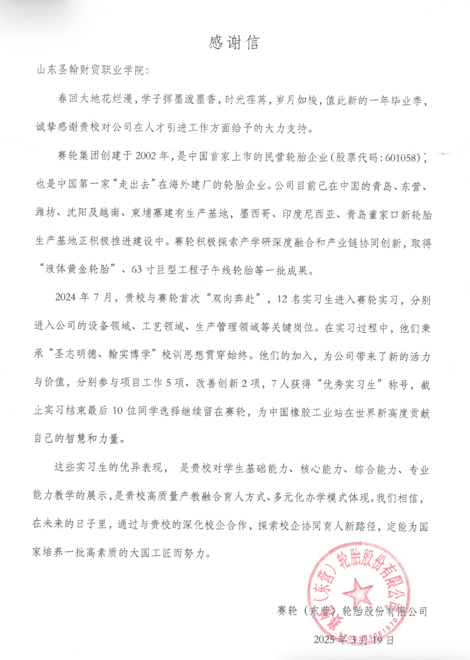 近日,赛轮(东营)轮胎股份有限公司向山东圣翰财贸职业学院智能工学院发来感谢信,对学校在人才引进方面给予的支持表达诚挚谢意。
