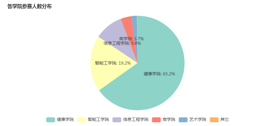 竞赛中,各学院积极参与,其中健康学院以65.2%的参赛人数占比和61.1%的获奖人数占比位居榜首,智能工学院紧随其后,参赛人数占比19.2%,获奖人数占比33.3%。信息工程学院、商学院等学院也展现了高度的参与热情与学习风貌,进一步推动了校园健康知识的普及。