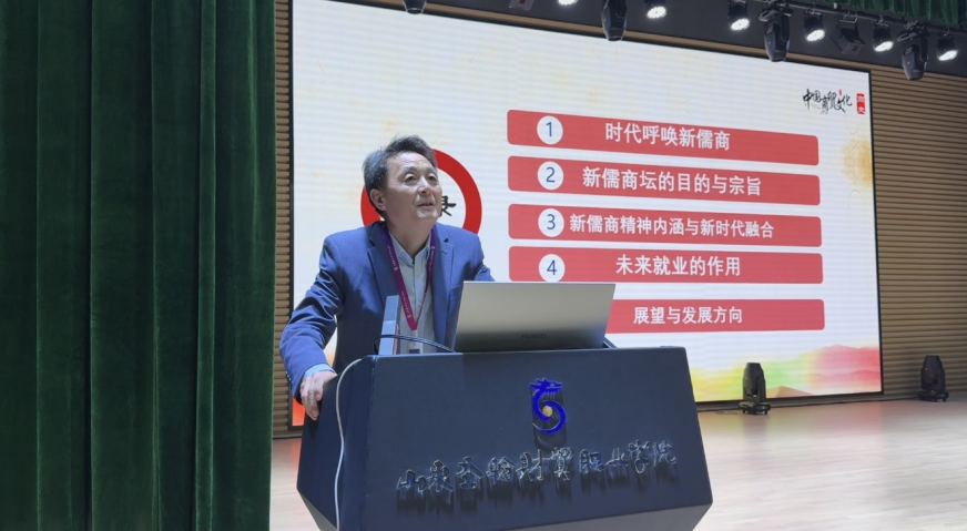 商学院客座教授贾善耕为大家带来了精彩的主旨报告。贾善耕在金融领域成就卓越,拥有丰富的实践经验和深刻的行业见解。他在报告中深入探讨了新儒商的内涵与特征,剖析了当前经济形势和商业案例,并分享了新儒商应具备的素质和社会责任。