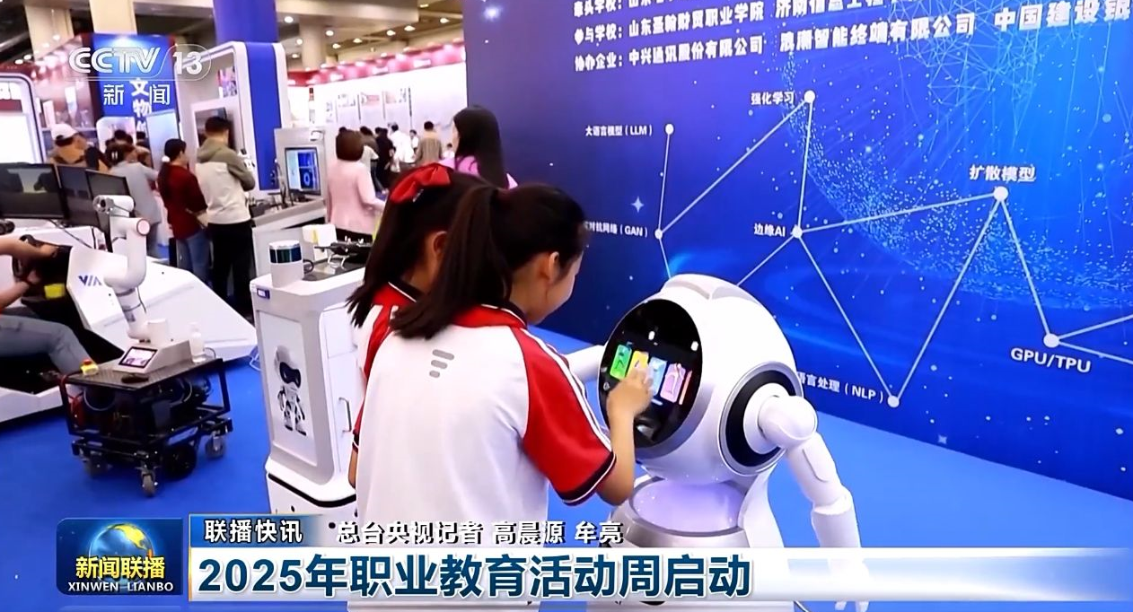 (5月11日,中央电视台《新闻联播》报道2025年职业教育活动周启动情况,图为我校参与的人工智能项目在山东省职教活动周职普融通体验区进行现场展示。)