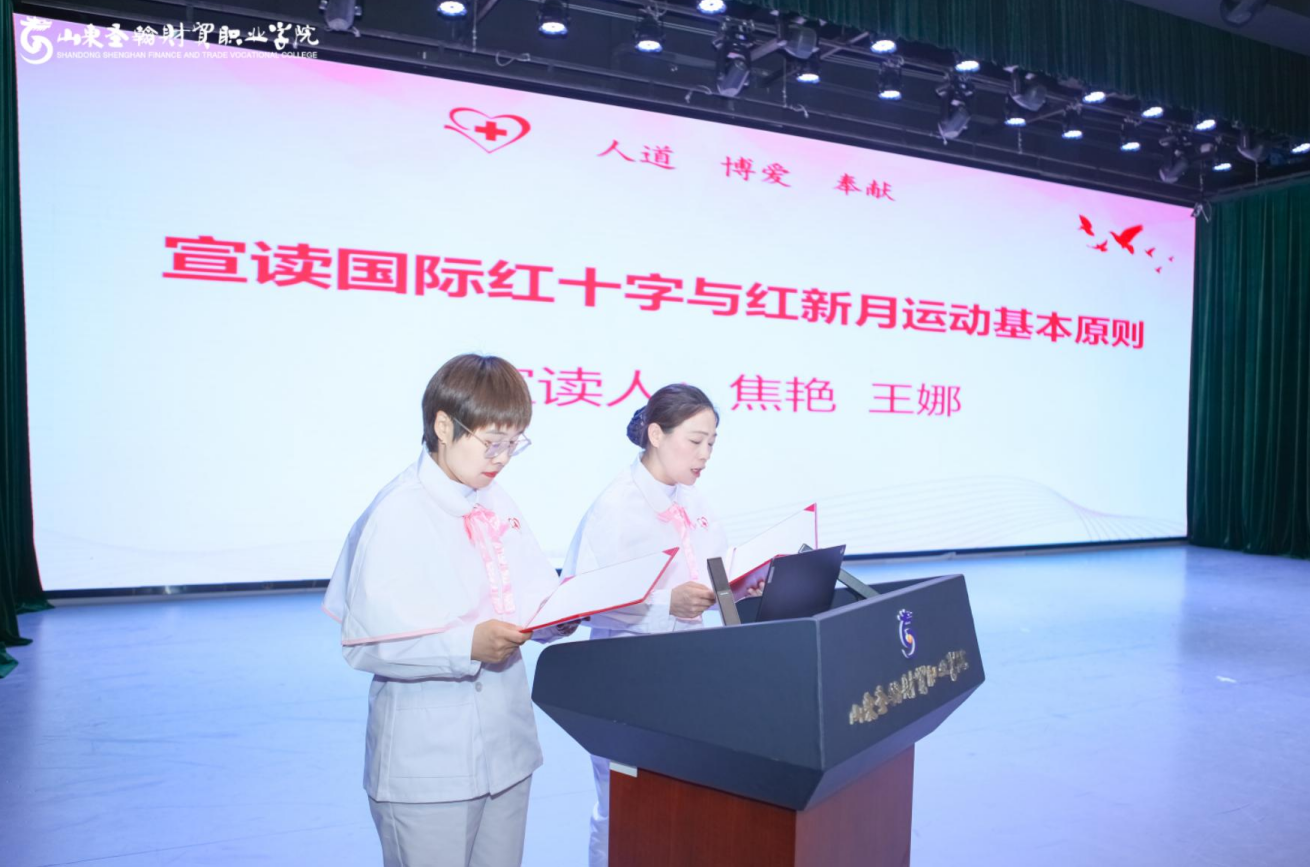 国歌奏响,全体人员肃然起立,齐声高唱。激昂的旋律回荡会场,彰显志愿护理服务队服务国家健康事业、赓续红色初心的坚定信念。随后,健康学院焦艳、王娜两位教师共同宣读《国际红十字与红新月运动基本原则》,为本次大会奠定了志愿服务的思想基础。