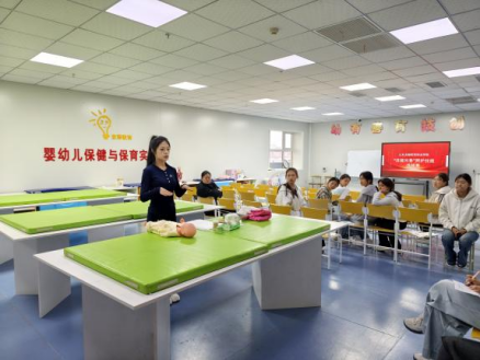 经历了学校选拔赛、模拟比赛,同学们迎来了11月2日省赛初赛告捷,此时留给师生们的备战时间仅余半月。面对全省顶尖选手的同台压力,团队迅速调整状态,开启“极限冲刺”模式:实训室成为“第二个家”——每天清晨,学生们已带着笔记本、操作模型准时到场,对着镜子练习沟通语气,连模型宝宝的摆放角度都要精准还原真实场景;指导教师下课后立马投入指导,从生活照料细节到早期教育引导策略,从应急处理流程到职业素养表达,每一个环节都反复推敲、逐项打磨。