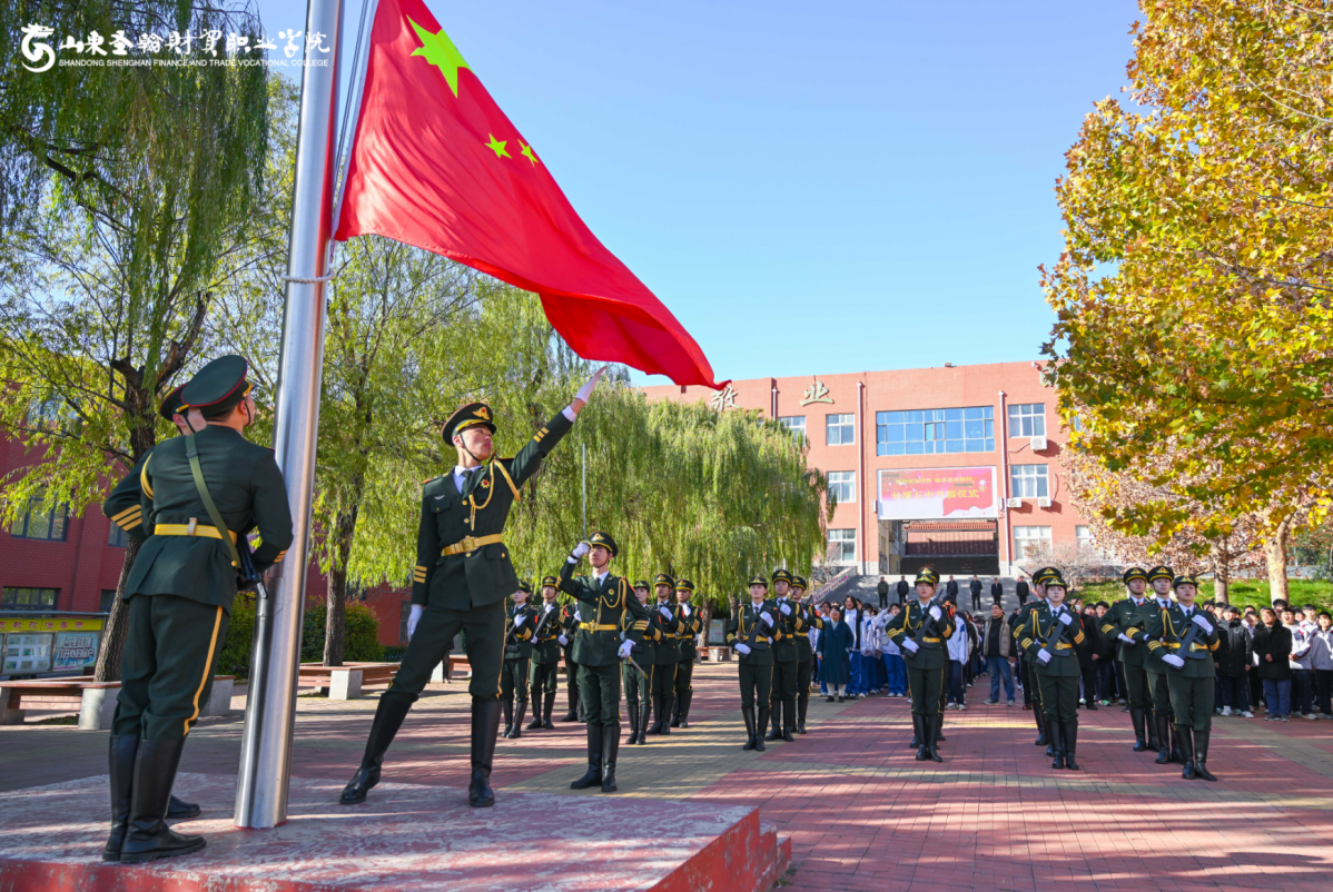活动在庄严的升旗仪式中拉开序幕。山东圣翰财贸职业学院国旗护卫队队员身着礼服,精神抖擞、步伐铿锵,迈着整齐划一的正步走向升旗台。伴随着雄壮的《义勇军进行曲》,五星红旗冉冉升起、迎风飘扬,全体人员肃立行注目礼,深切感受国旗的庄严与国家的荣耀,爱国情怀在心中激荡。