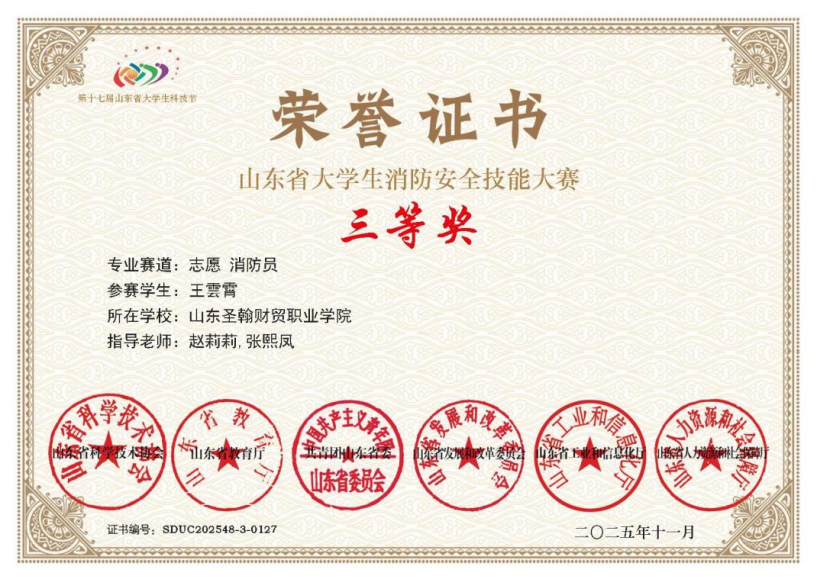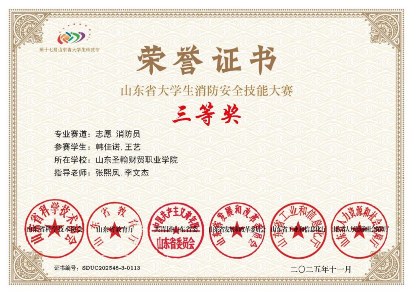 近日,第十七届山东省大学生科技节山东省大学生消防安全技能大赛圆满落幕。山东圣翰财贸职业学院智能工学院学子凭借扎实的消防安全知识、娴熟的实操技能和默契的团队协作,在众多参赛队伍中脱颖而出,斩获三等奖两项,充分展现了学院学子良好的安全素养和过硬的实践能力。