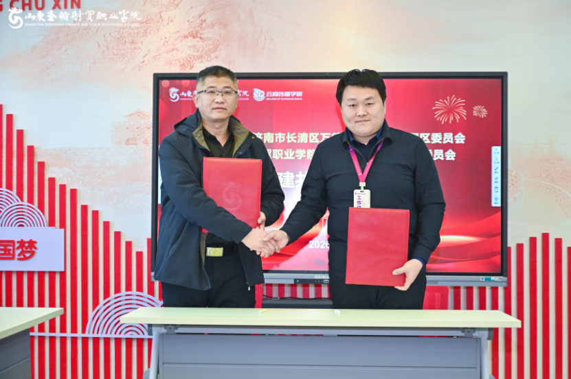 签约仪式上,双方代表共同签署党建共建合作协议,标志着山东圣翰财贸职业学院云商传媒学院党总支与济南市长清区万德街道8号路管理区党委的合作迈入规范化、长效化发展新阶段。
