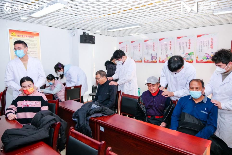 讲座结束后,健康学院康复治疗技术专业负责人杨帆带领学生为现场居民进行肩颈推拿。中医推拿是一种古老而富有实效的疗法,其以阴阳五行、脏腑经络等中医理论为指导,运用手法刺激人体经络、穴位,以达到调和气血、平衡脏腑功能、祛除疾病的目的。整个义诊活动中,志愿者师生还为居民免费测量血压。居民们收获了专业的健康知识,获益匪浅。