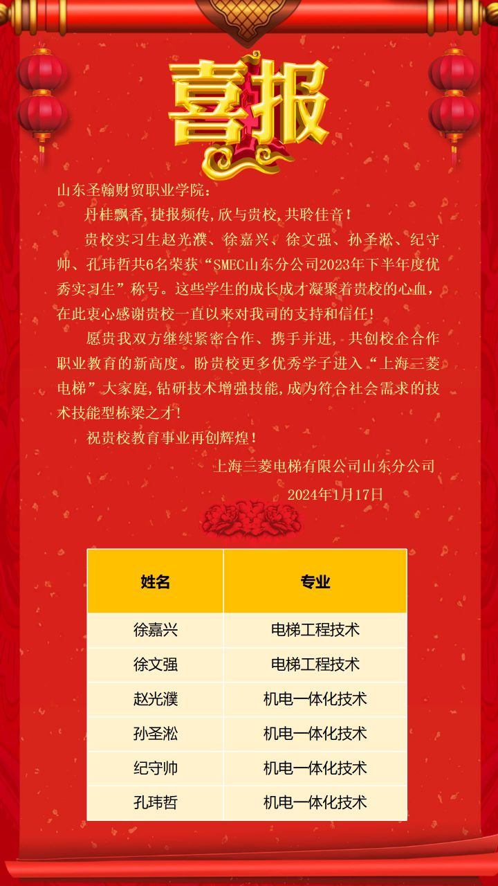 2024年1月17日,智能工学院收到了一封来自学生实习单位上海三菱电梯有限公司山东分公司的表扬信,信中对实习的六位同学给予了高度评价。