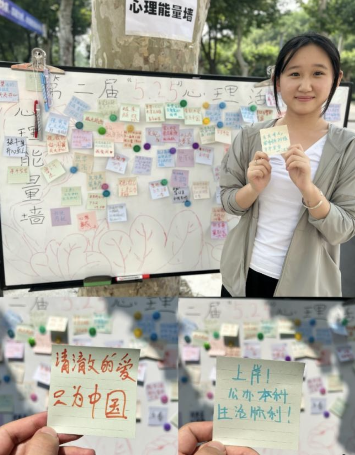 在身心宣泄区,参与者通过击打假人、书写心理便贴等方式表达自我、缓解情绪释放压力。参与者们纷纷驻足,并在心理能量墙上写下自己对国家和家庭的祝愿,对生活与学业的期盼,对家人与朋友的祝福。在脑力挑战区,参与者激发和锻炼自我的手脑配合能力、逻辑思辨能力、表达沟通能力。在身心舒展区,参与者通过体验团队配合过程,激发竞争与合作,提高自我适应能力。在艺术疗愈区,参与者用色彩传达情绪,用画笔传递感受,用艺术彩绘疗愈内心。一位活动参与者向彩绘老师解释自己的图画寓意“手臂彩绘很新奇,我在手臂上彩绘了锦鲤,希望自己用心生活,好运常伴”。