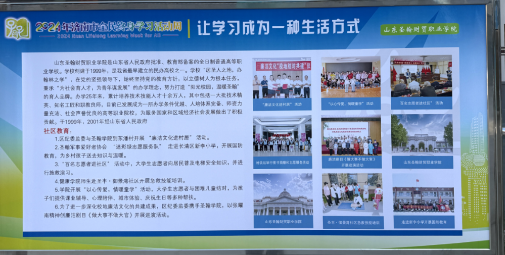 2024年11月7日,2024年济南市全民终身学习活动周开幕式在济南高新区文化中心隆重举办。山东圣翰财贸职业学院受邀积极参加此次活动。