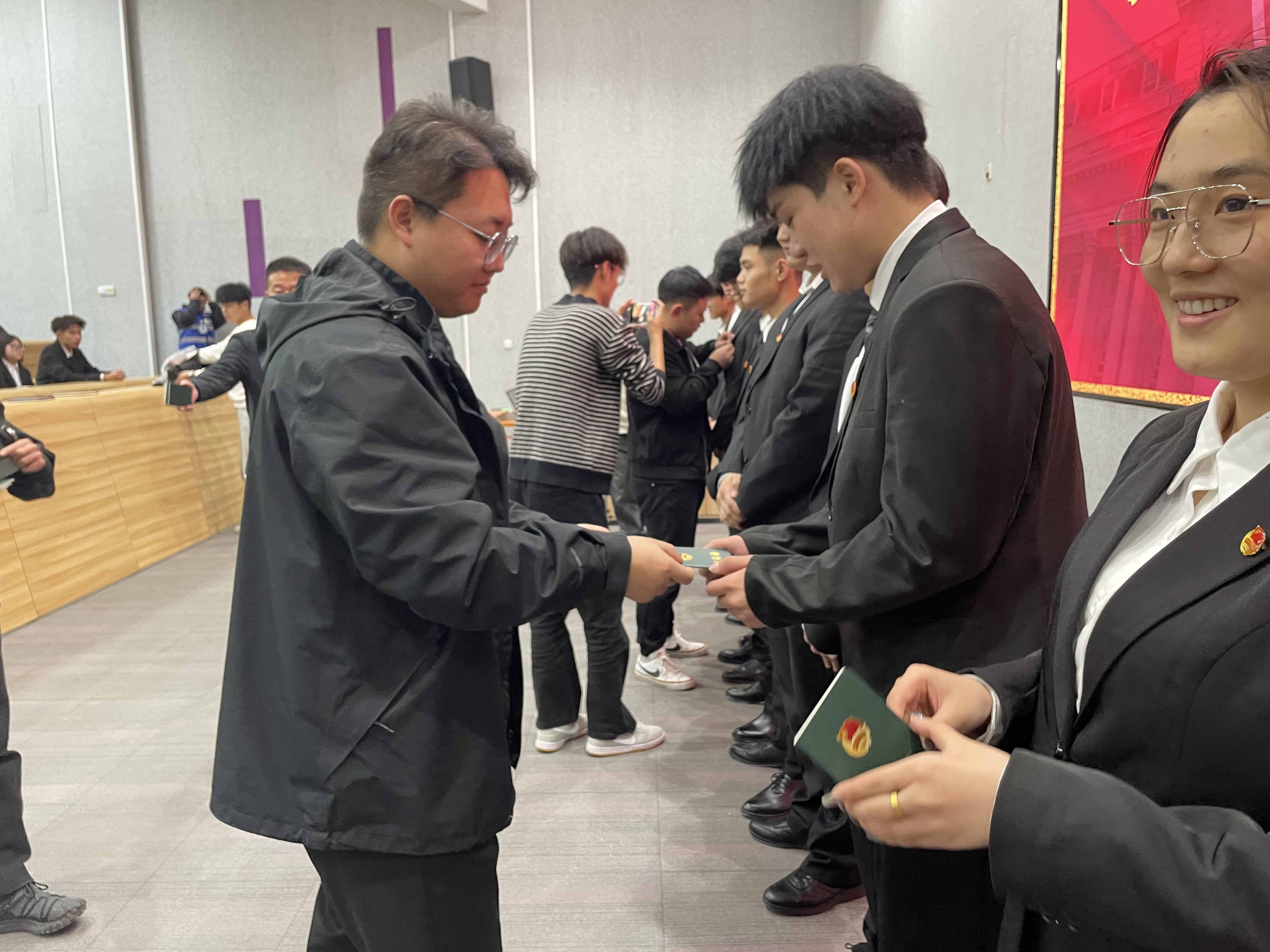 团总支书记宋占喜指出,共青团员作为党的忠诚助手和可靠后备军,身处实现中华民族伟大复兴这一关键历史交汇点与战略机遇期,肩负着不可替代的时代重任。随后,宋占喜和各位老师为新团员颁发并佩戴团徽。这一细微却意义非凡的举动,宛如一颗火种点燃了新团员内心深处的使命感火焰,象征着他们正式肩负起共青团员的神圣责任与无上光荣使命。那闪耀在胸前的团徽,恰似一盏熠熠生辉的明灯,照亮青年们前行的漫漫征途,时刻警示着他们要以共青团员的高标准严要求时刻约束自己。最后,宋占喜带领新团员庄严宣誓。新团员们个个握拳举臂,目光坚毅如钢,这气壮山河的誓言,不仅仅是对个人信仰追求的崇高宣誓,更是对团组织和党的无限忠诚与坚定不渝的庄严承诺。它彰显了青年一代在党和国家波澜壮阔事业发展进程中的豪迈历史担当,表达了为共产主义远大理想和中国特色社会主义共同理想奉献青春韶华、智慧才华与全部力量的钢铁决心与坚定信念,是新时代青年对国家、对民族、对人类命运的庄重誓言。