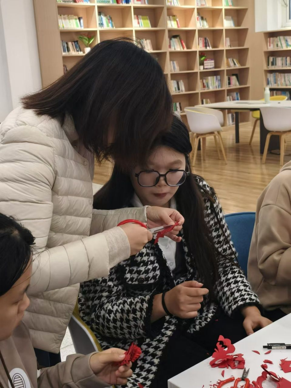 此外,活动还特别安排了人物剪纸的教学环节。相较于团花剪纸,人物剪纸对技艺的要求更高,需要更加精细的刻画和丰富的想象力。在“校园剪纸达人”们的悉心指导下,同学们逐渐掌握了如何捕捉人物的神态特征、如何运用线条表现人物的动态等关键技法。经过多次练习,不少同学已经能够独立完成一幅栩栩如生的人物剪纸作品。