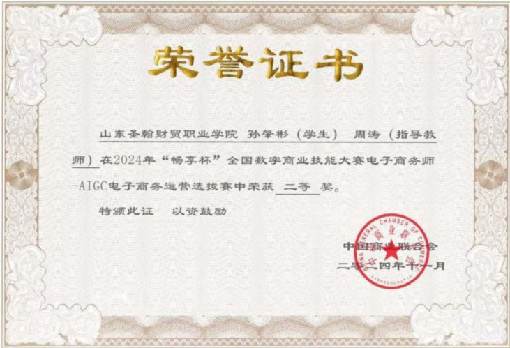 近日,由中国商业联合会主办的2024年“畅享杯”全国数字商业技能大赛电子商务师—AIGC电子商务运营选拔赛满落幕。经过激烈比拼,山东圣翰财贸职业学院云商传媒学院的3名学子凭借出色的专业技能在竞赛中再创佳绩,获得二等奖1项,三等奖2项。