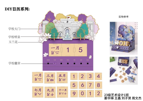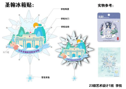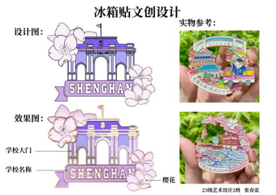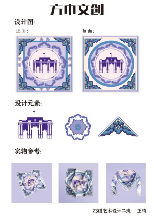 经过为期一周的时间,在艺术设计教研室李姗姗主任、杨越老师、王一舟老师的指导下,2023级艺术设计学生围绕大赛主题设计出了一系列优秀的文创作品。其中有精美的校园风景冰箱贴、珐琅挂件、立体卡通日历、校园元素的发簪、方巾、办公用品以及学习用品等等,种类非常丰富。