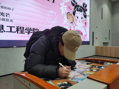 创意互动,寄语未来成长。活动以“慢递邮局”为核心载体,为女生们搭建了一个与未来对话的桥梁。现场精心布置了主题展台,悬挂花朵气球与励志标语,充满仪式感。每位女生领取专属明信片后,认真书写下对未来一年的规划与期许。有的同学写下学业目标,如“通过计算机二级考试”“提升专业技能”;有的关注自我成长,希望“学会时间管理”“坚持运动健身”;还有的写下对友情、亲情的珍视与感恩。这些承载着青春梦想的明信片被统一封存至“时光信箱”,一年以后,信箱开启,明信片返还至学生手中,让她们见证自己的蜕变与成长。