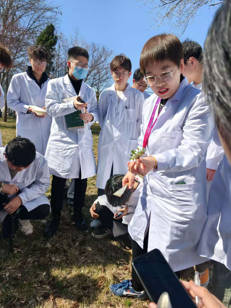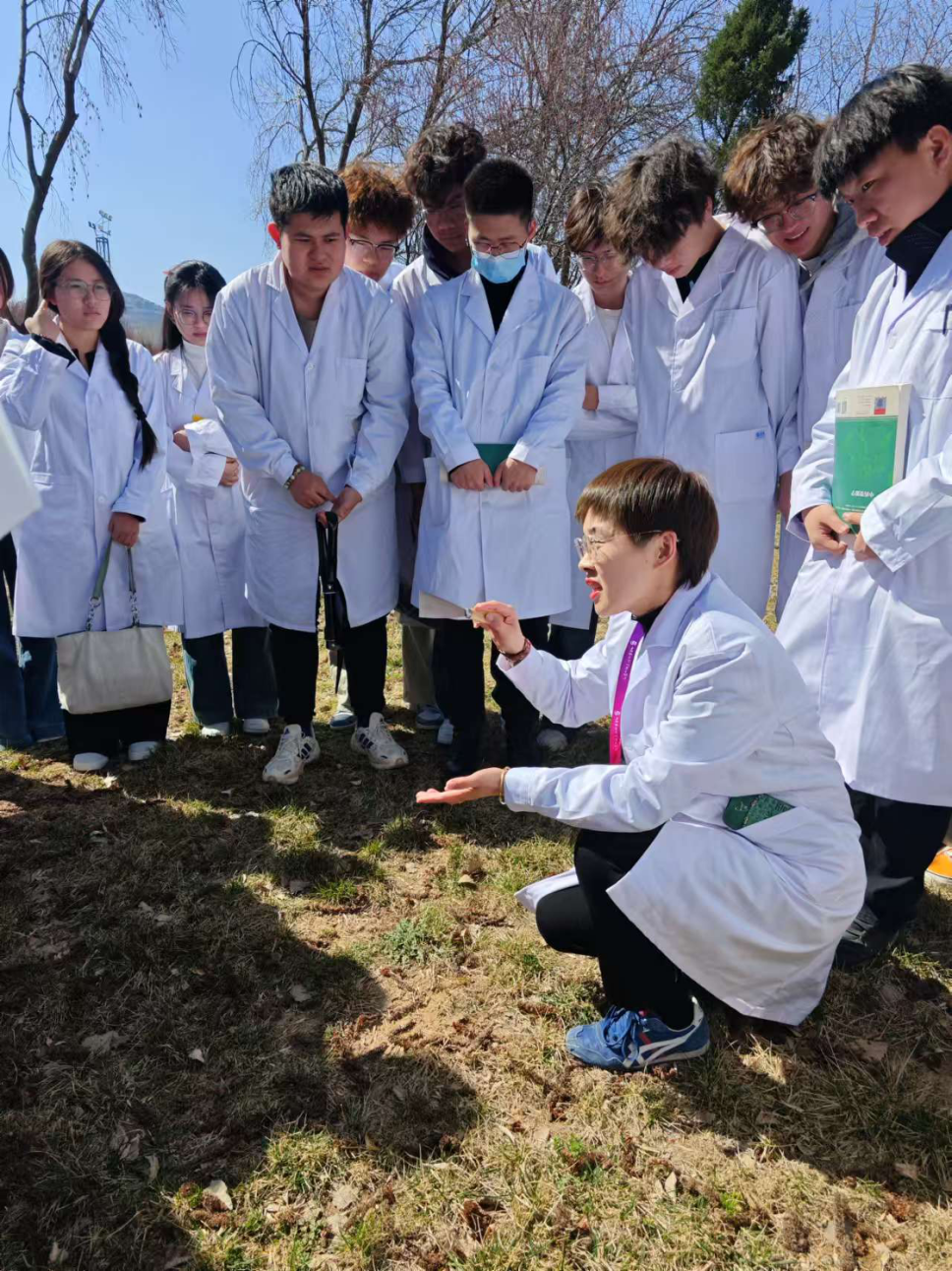 作为中药学领域的资深教师,王娜在此次实践课堂中带领学生们在校园内实地观察并讲解了多种常见的药用植物,如蒲公英、车前草、夏至草、紫花地丁、茵陈等,并详细介绍了这些植物的药用价值、生长习性以及在中药学中的应用。