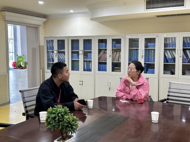 在智慧熊幼儿园,聂守龙深入了解了实习生的工作环境、岗位职责以及实习期间的成长与收获。他通过与实习生面对面交流,细致询问了他们在实习过程中的学习体会、遇到的困难以及需要学院提供的帮助和支持。