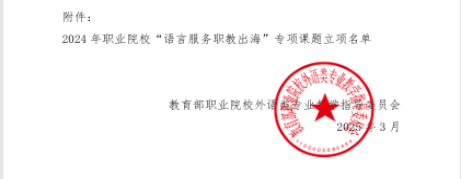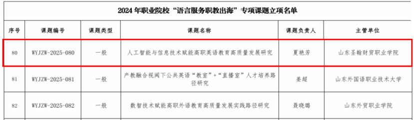 2025年3月26日,教育部职业院校外语类专业教学指导委员会(以下简称“外语教指委”)公布了2024年职业院校“语言服务职教出海”专项课题立项名单。山东圣翰财贸职业学院公共基础部大学英语教研室夏艳芳团队申报的课题《人工智能与信息技术赋能高职英语教育高质量发展研究》经过专家评审组严格评审,成功获批立项,成为全国133项立项课题之一,展现了我校在职业教育国际化与语言服务领域的科研实力。