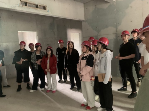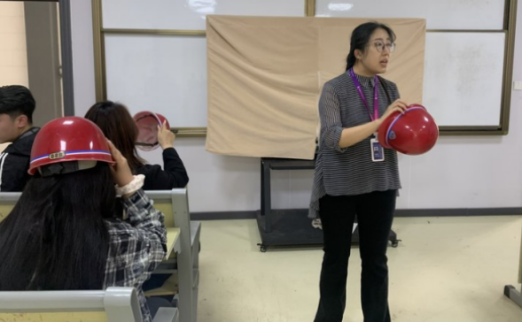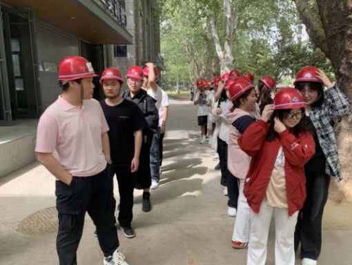 活动前,任课教师张熙凤强调了安全注意事项,为学生们分发并指导佩戴安全帽等防护装备,确保每位学生的人身安全。随后带领学生们来到学校宿舍楼施工现场。