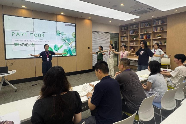 紧接着,轮岗专职教师郇雪纯通过舞动治疗带领大家进入了一场沉浸式的心灵体验,参与者们体验几种不同的呼吸训练,并且跟随音乐,进行一对一的镜像身体模仿,每组活动者在相互模仿中不仅相互协调,建立信任,并且通过自由地舒展身体进行情绪的释放。最后,参与者在与自己身体的对话中,释放压力、舒缓情绪,重新找回内心的平静与力量。