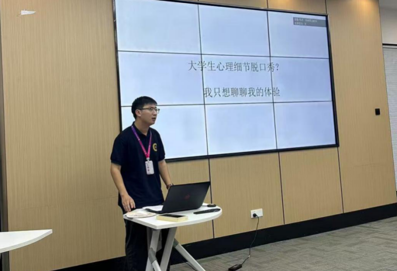 活动最后,轮岗辅导员宋志远结合日常生活中的心理现象和热门话题,用妙趣横生的段子和生动形象的演绎,将心理健康知识融入其中,为大家带来一场心理脱口秀表演。活动现场观众时而捧腹大笑,时而陷入思考,在轻松愉悦的氛围中,宋志远老师从心理视角解析自己学生管理中的实际案例,让参与者对心理健康有了更直观、更深刻地认识。