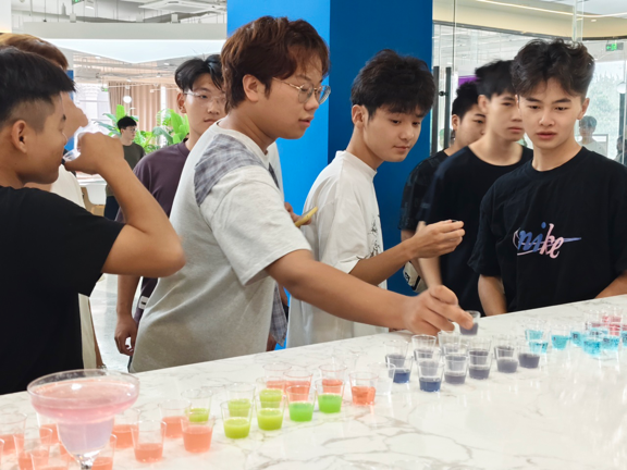 创梦空间内设置多个特色板块,满足不同学生的兴趣与需求。师生们走进“翰墨春秋”书法镌刻艺术工作室,墨香与木石气息扑面而来。整齐陈列的笔墨纸砚,让同学们有机会在笔墨挥洒中感受中华优秀传统文化的魅力;走进“乳酸π工坊”工作室,酸甜的果香与醇厚的奶香瞬间激活了感官。同学们饶有兴致地品尝工坊研发的鸡尾果饮、咖啡饮品以及奶昔系列,点燃了学生们将理论知识转化为创新实践的灵感。
