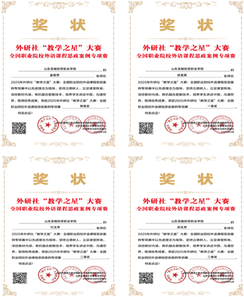 9月10 日,2025年外研社“教学之星”大赛-全国职业院校外语课程思政案例专项赛评选结果正式揭晓。山东圣翰财贸职业学院公共基础部大学英语教研室教师凭借扎实的教学功底、深刻的思政内涵挖掘与创新的教学设计理念,在全国众多参赛作品中脱颖而出,一举斩获四项荣誉,其中夏艳芳老师荣获特等奖,徐宜英老师荣获一等奖,代玉萍、邱玉芳两位老师同获二等奖,充分展现了学校外语课程思政建设的卓越成果与教师队伍的过硬教学实力。