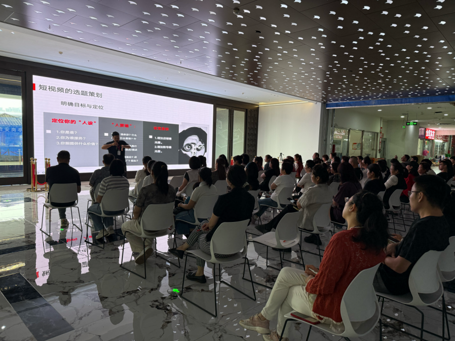 本次培训聚焦“短视频前期策划”主题,由云商传媒学院新媒体运营教研室主任周晓瑜担任主讲,数字媒体技术教研室张子茹提供现场技术支持。参会人员包括世购商贸广场各品类商户代表百余人,现场座无虚席,学习氛围浓厚。