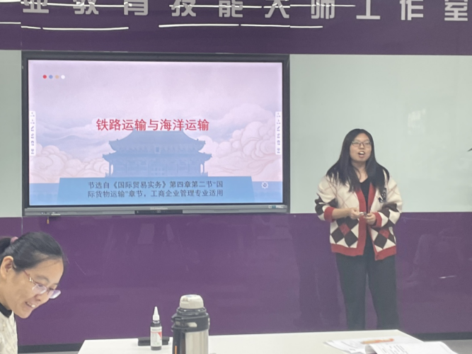 工商管理教研室的刘晓洁围绕“铁路运输与海洋运输”展开,对比分析两种运输方式的特点、成本与适用场景,结合实际案例,让知识更具实用性。她熟练运用多媒体教学手段,配合简洁工整的板书,清晰呈现教学内容,教学组织有条不紊。