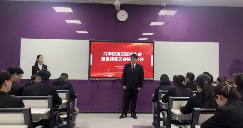 近日,商学院第四届学生会暨自律委员会主席团换届大会在学院教室吉纯楼116隆重召开。本次大会以“四载薪火,商学院领航者再起航”为主题,通过“回顾·传承·展望”三个环节,完成了学院学生会核心团队的交接与使命传承。学院院长盖晓艳、学生管理副院长李磊、学院全体辅导员老师齐聚一堂,共同见证这一重要时刻。
