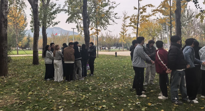 活动选址于校园内一片静谧的树林。初冬时节,柏树绿黄交织,脚下松软的土地营造出宁静放松的氛围,让同学们在忙碌的学习工作中获得片刻宁静。