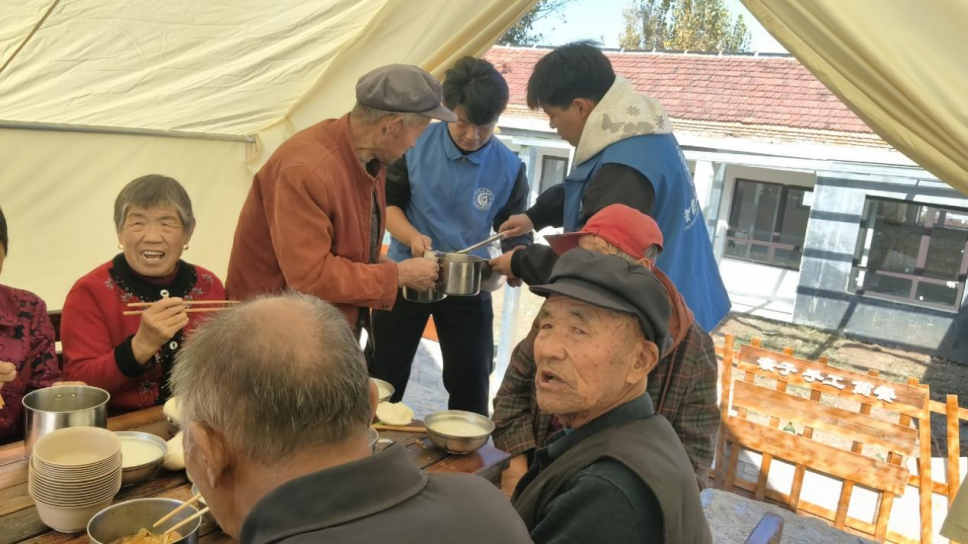 临近正午,志愿者们在村头搭建的临时帐篷里支起炉灶,为村里的老人和农户盛上热气腾腾的饭菜。大家一边递饭递菜,一边和老人们拉家常,听他们讲五峰山的故事,问他们冬天取暖、日常起居的需求。