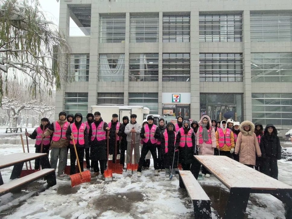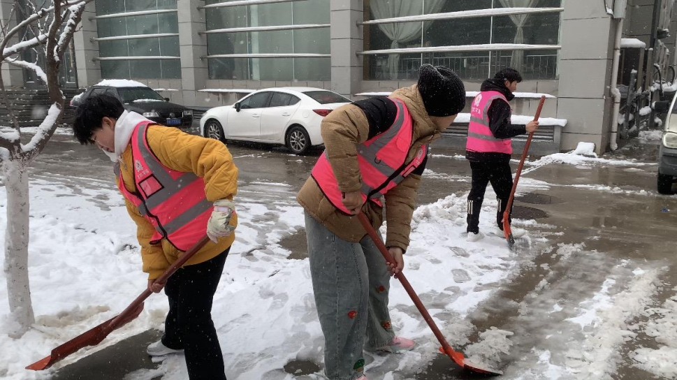 活动伊始,已向学校后勤处申领了铁锹、扫帚、雪推板等清扫工具。参与人员集合签到后,被划分为若干小组,有序前往艺术学院教学楼出入口、校内主干道、宿舍楼与教学楼连接路段等重点区域,开展积雪清扫工作。