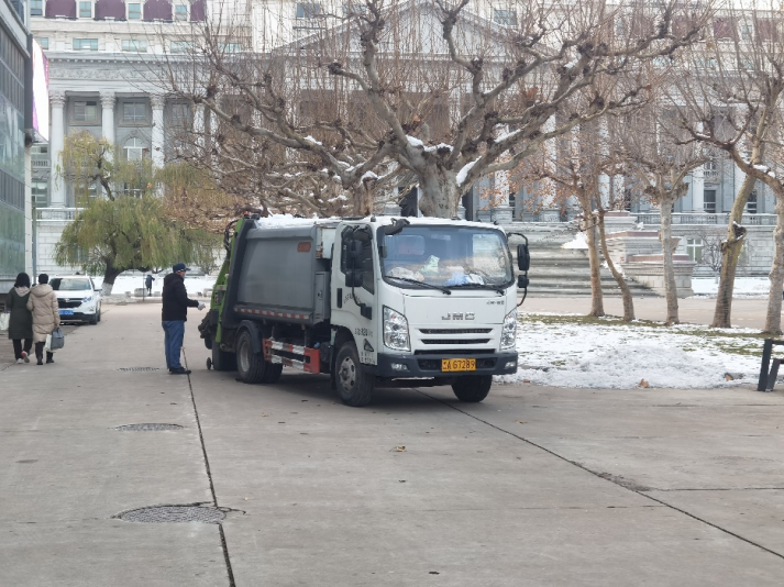 在教学楼旁的雪地中,保洁人员手持工具,仔细清理着步道上的积雪与落叶,连角落的杂物也逐一拾捡;垃圾清运车准时停靠在指定区域,工作人员冒着寒气分类转运垃圾,确保校园环境整洁有序。寒风吹红了他们的脸颊,雪水浸湿了鞋边,但忙碌的身影始终不停歇——从清扫积雪到维护设施,每一项工作都细致入微。