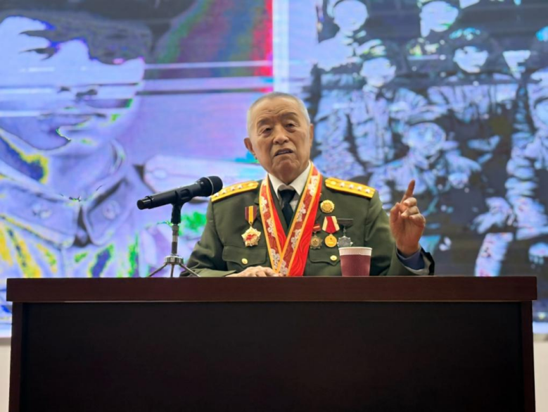 师生代表抵达济南干休所后,首先向展先勇同志致以诚挚问候。作为本次主题教育的核心环节,展先勇同志以自身抗战经历为蓝本,为师生们讲授了一堂鲜活生动的红色主题教育课。展先勇同志深情回顾了烽火连天的抗战岁月,生动讲述了极端艰苦条件下,中国军民同仇敌忾、不畏强暴、血战到底,以生命捍卫国家主权与民族尊严的悲壮历程。一个个真实可感的战斗故事、一幕幕刻骨铭心的历史细节,将师生们带入救亡图存的艰难年代,让大家在沉浸式聆听中深刻感悟和平生活的来之不易,更直观体会到革命先辈的家国情怀与责任担当。展先勇同志特别强调,铭记历史不是延续仇恨,而是要从历史中汲取奋进力量,希望青年一代以史为鉴、珍视和平,将爱国热情转化为担当时代使命的实际行动。