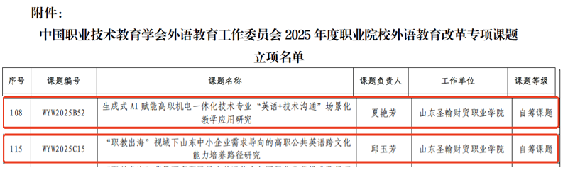 近日,中国职业技术教育学会公示了《关于外语教育工作委员会2025年度职业院校外语教育改革专项课题拟立项名单的通知》。山东圣翰财贸职业学院公共基础部教师申报的两项课题成功入选,展现了该部门在教学研究与学术创新方面的扎实积累。