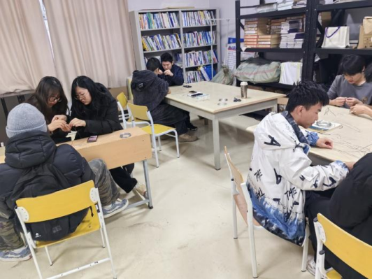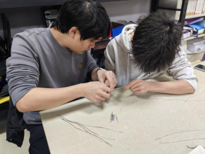 实践环节采用“理论精讲—示范操作—分组实训—对比分析—优化提升”的闭环教学模式。赵凤仙老师将同学们带入建筑实训室。借助不同直径的钢丝(模拟不同规格钢筋)、绑丝、直尺、模拟梁体框架等实训器材,现场演示梁内钢筋绑扎的标准流程:针对梁体钢筋的受力特点,详细演示如何通过钢丝直径的搭配、绑扎点的分布,提升结构整体承载能力,并明确搭建完成后,将书本作为模拟荷载的堆叠方式与受力观测要点。