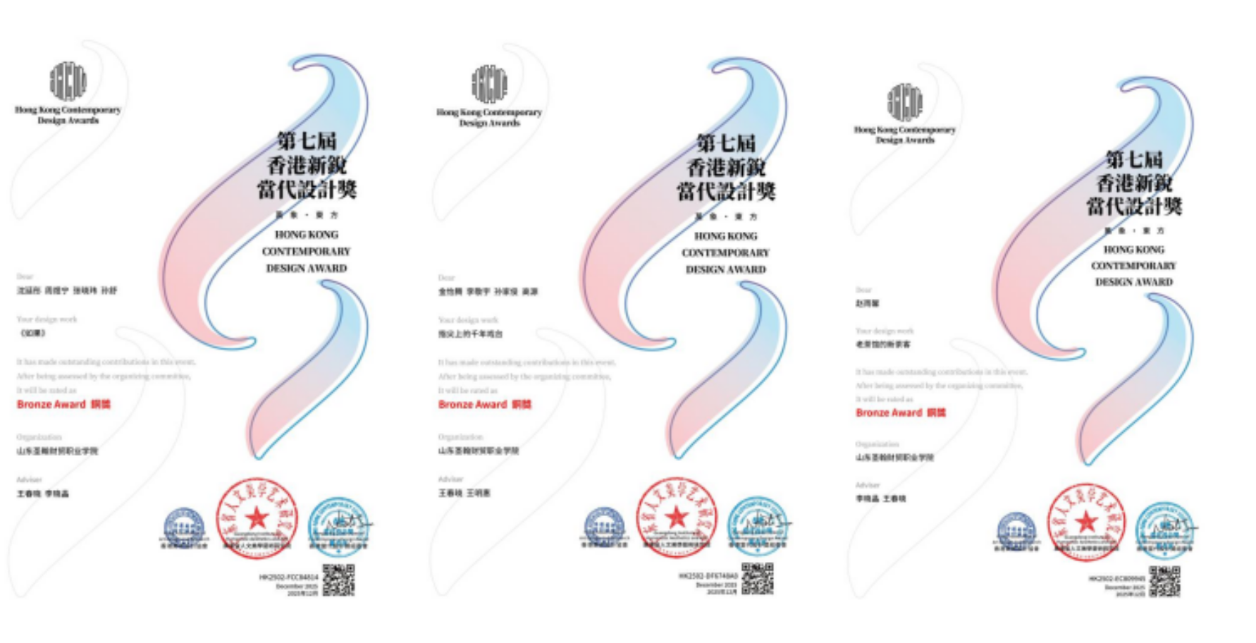 近日,第七届香港新锐当代设计奖获奖名单公布。云商传媒学院数字媒体技术教研室王春晓、李晓晶两位老师带领的学生团队表现亮眼,凭借多部原创视频与动画作品斩获三项铜奖,两位指导教师也同步荣获“优秀指导教师”,为学院再添荣誉。