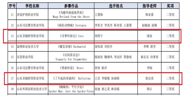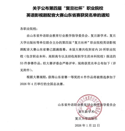 近日,从复旦新学术官网获悉,在第四届“复旦社杯”全国职业院校英语影视剧配音大赛山东赛区比赛中,山东圣翰财贸职业学院选派的学生团队表现突出,来自云商传媒学院的周煜宁同学荣获个人二等奖,来自健康学院的王昱、李媛媛、孙福硕三位同学荣获团体二等奖。公共基础部大学英语教研室徐宜英老师和庞宸老师荣获“优秀指导教师”称号。