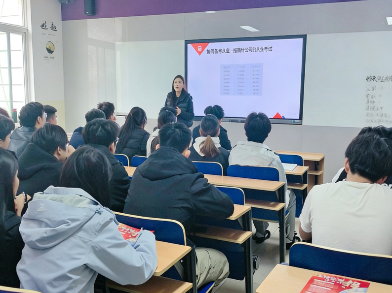 本次讲座以“2026就业真相:选对赛道,比努力更重要”为核心,武莹莹专家从四大维度展开专业分享。在2026就业大环境分析中,她深入剖析了当前高校毕业生就业竞争白热化的挑战,同时聚焦新质生产力相关领域的人才缺口红利,让同学们清晰认识到AI、半导体、新能源、低空经济等领域的发展机遇;在三大高薪赛道解读环节,重点讲解了金融科技、人工智能全产业链、新能源与智能制造三大领域的行业优势、核心岗位与发展方向,其中详细介绍了指南针科技在金融科技领域的行业地位、业务布局,以及公司极具竞争力的薪资体系、完善的福利保障和广阔的职业发展空间,为相关专业学子提供了精准的就业参考;针对在校准备阶段,武莹莹专家给出实操性建议,指导同学们打造不可替代的核心竞争力,包括掌握专业技能、积累项目经验、制作优质实战履历、提前了解行业规则等,同时介绍了证券行业从业考试的备考要点,以及指南针科技为求职者提供的免费学习系统、报考名额等专属支持;在互动答疑环节,专家针对同学们关心的专业不对口就业、大公司与小公司选择等高频问题逐一解答,给出专业建议,并鼓励同学们把握赛道红利,夯实自身基础,主动对接行业需求。