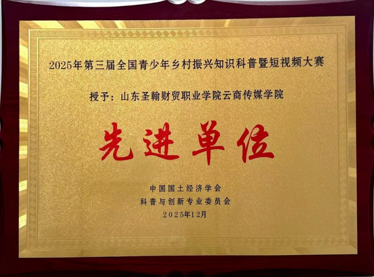 近日,由中国国土经济学会主办的“第三届全国青少年乡村振兴知识科普暨短视频大赛”圆满落幕。作为本次赛事的承办单位,山东圣翰财贸职业学院云商传媒学院凭借严谨高效的组织工作、师生的优异参赛表现,被中国国土经济学会授予“先进单位”荣誉称号,这也是学院连续第二次成功承办该赛事,充分彰显了学院在数字传媒领域的组织实力与育人成效。