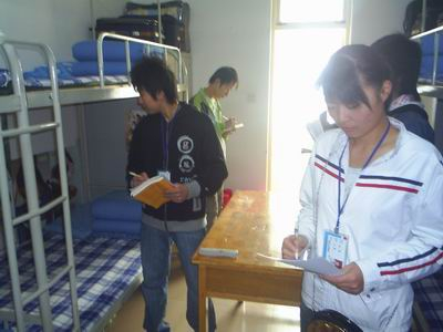 在2012.09.06日上午,由宿管科老师带领学生展开全校卫生大检查,由老师带领同学明确分工严格进行检查,会对宿舍整体环境、地面卫生、内务、洗手间进行评分,对优秀的宿舍和卫生差的宿舍都要进行拍照,给予表扬与批评,对于违章电器更要严格检查。